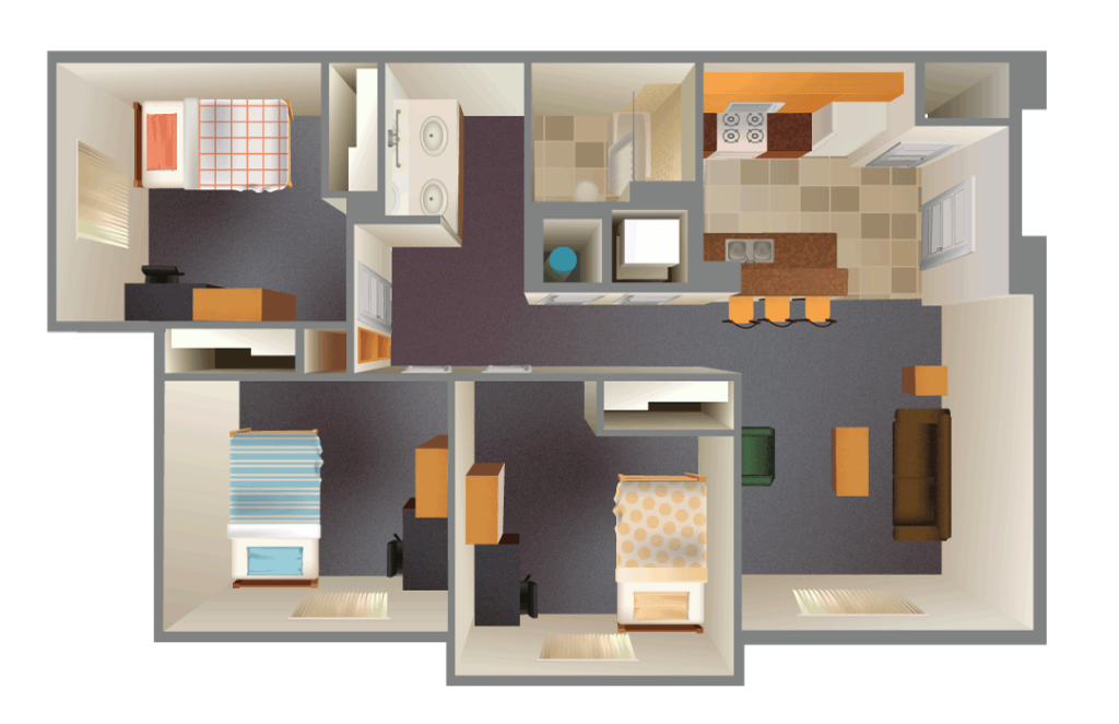 At McKay Village, you’ll find a space that supports your academic and personal life. Choose from four apartment layouts, each featuring a fully equipped kitchen, spacious living area, and a washer and dryer for ultimate convenience.