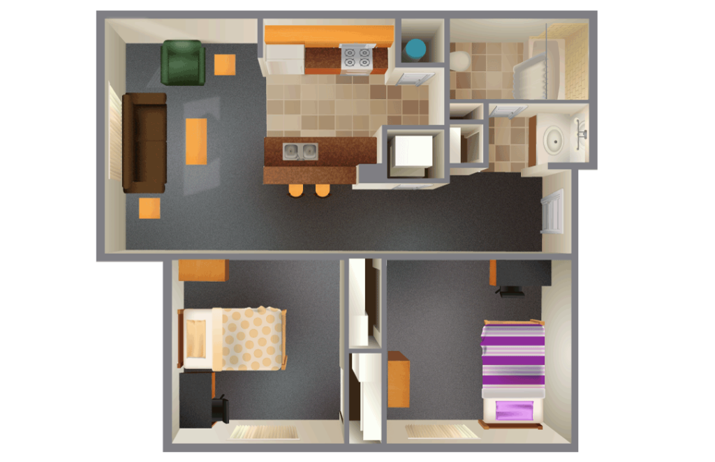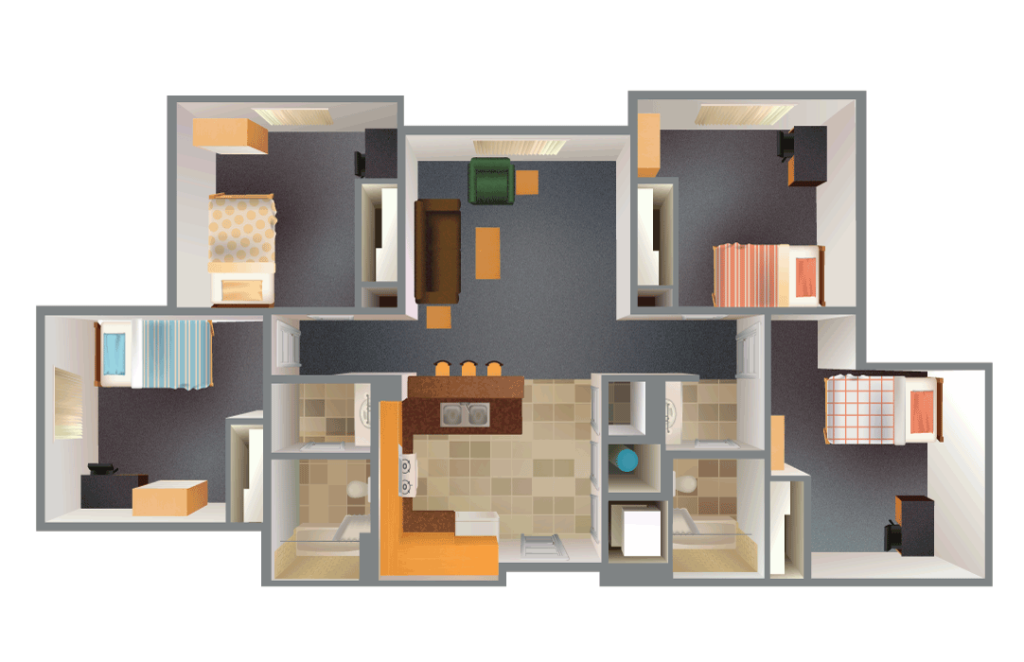 - Two-bedroom, two-bathroom (shared bedrooms, four students)