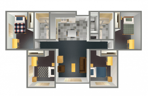 Pine Ridge Village offers apartment-style living for juniors, seniors, and graduate students. Here, you’ll enjoy the comfort of a private bedroom while sharing a fully equipped apartment with three other students, including two shared bathrooms, a living room, and a full kitchen.