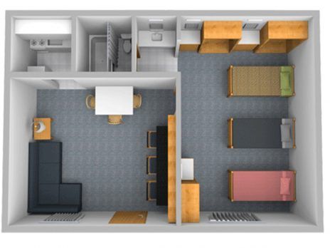 - One-bedroom layout housing three students